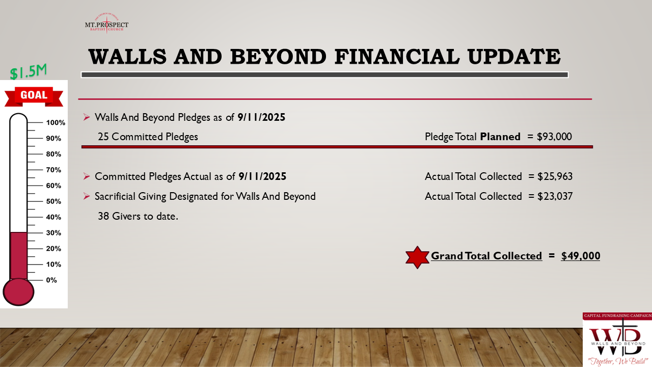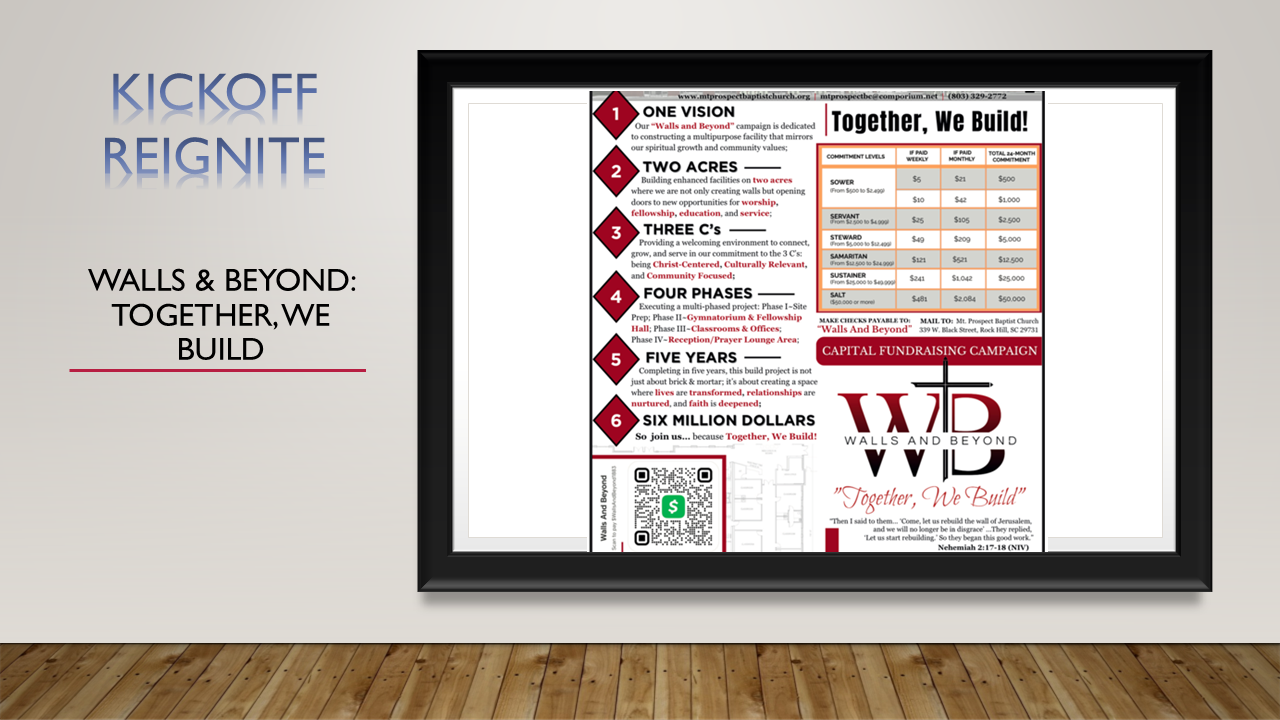 Our "Walls and Beyond" campaign is inspired by Nehemiah's call to rebuild Jerusalem's walls; a mission fueled by faith, unity, and a vision for a better future. Just as Nehemiah rallied the people to rebuild and restore, we too are called to strengthen our church, both physically and spiritually. This campaign is not just about brick and mortar; it's about creating a space where lives are transformed, relationships are nurtured, and faith is deepened.